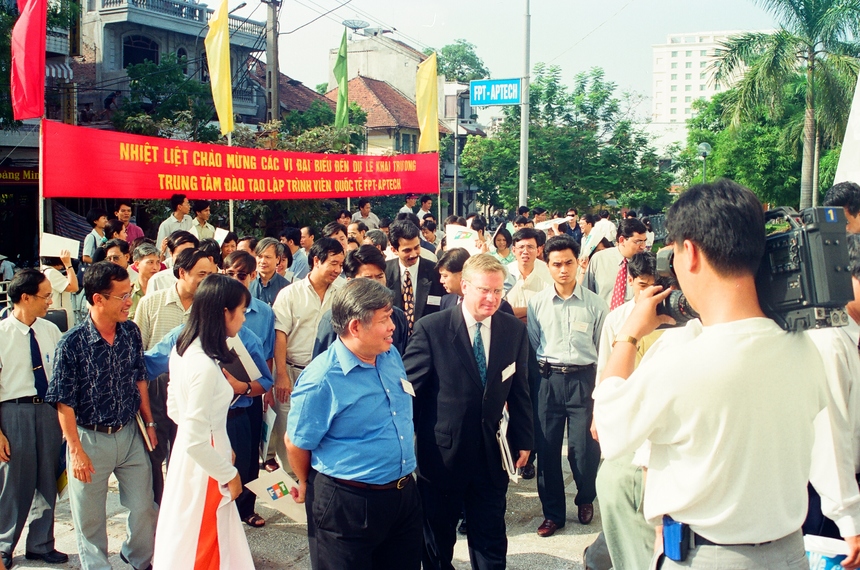 Ban giám hiệu FPT-Aptech hướng dẫn đoàn tham quan tại lễ khai trương tháng 9/1999.