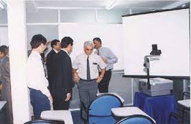 Đoàn tham quan chụp ảnh lưu niệm trong phòng học lý thuyết của FPT-Aptech tại Lễ khai trương tháng 9/1999.