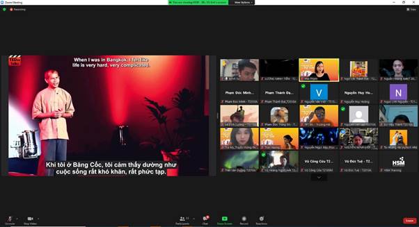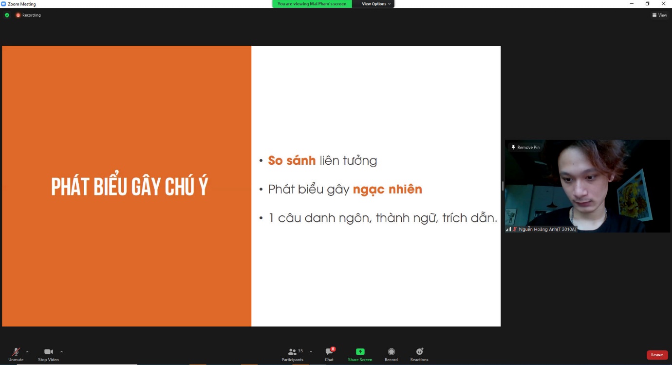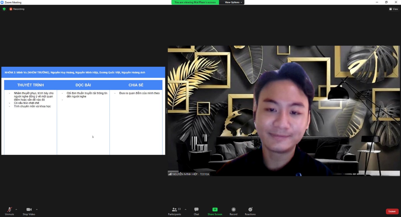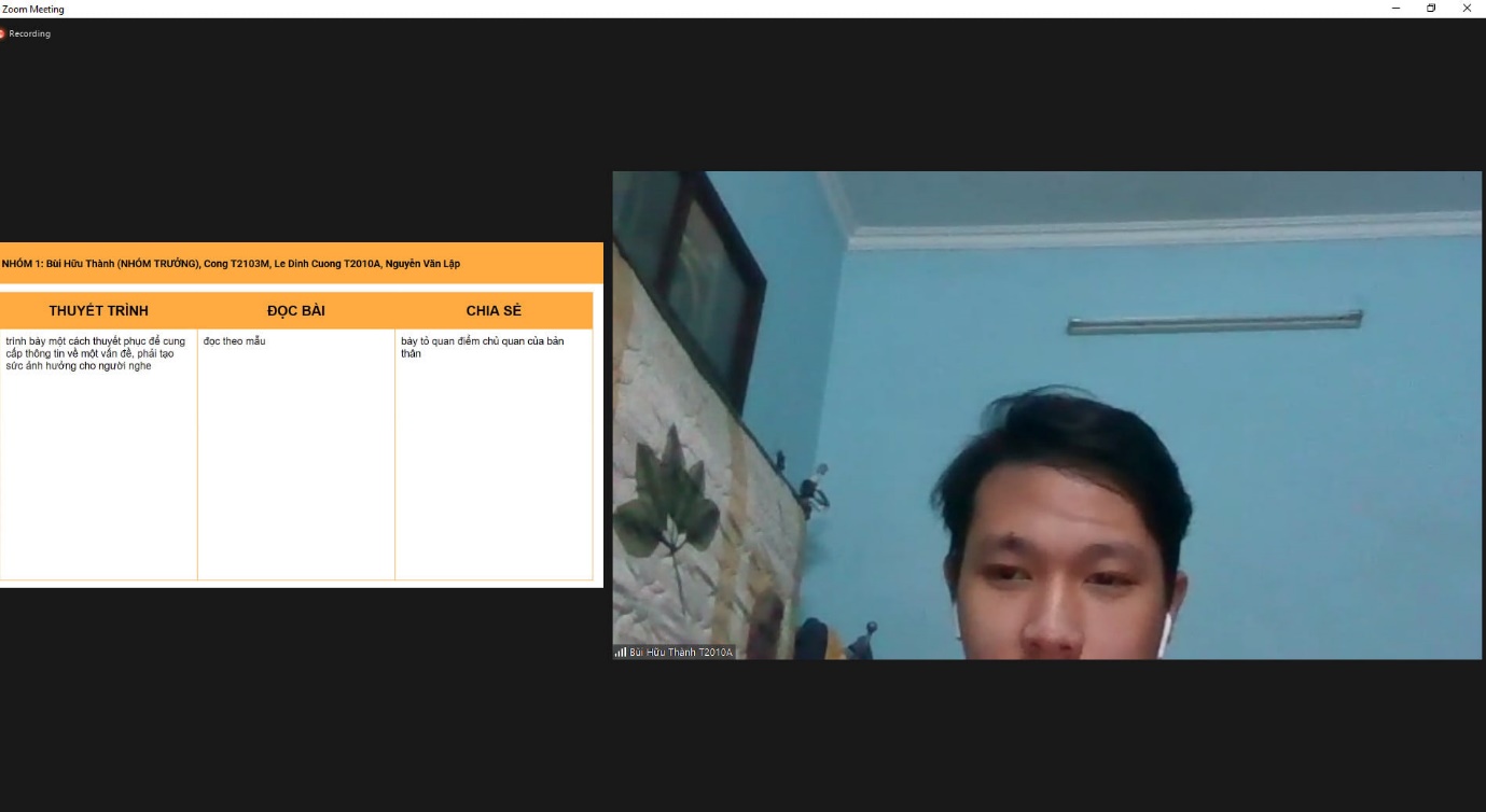 Sau mỗi phần học, cô Mai sẽ chia nhóm (break out) trên nền tảng Zoom để các bạn sinh viên có thể thực hành nhóm với nhau. Bên cạnh đó vẫn có những bài tập nhỏ cá nhân là cơ hội để mỗi sinh viên thể hiện bản thân mình. Có bạn lần đầu nói trước đông người, có bạn được thể hiện cá tính khi nói đến chủ đề yêu thích…