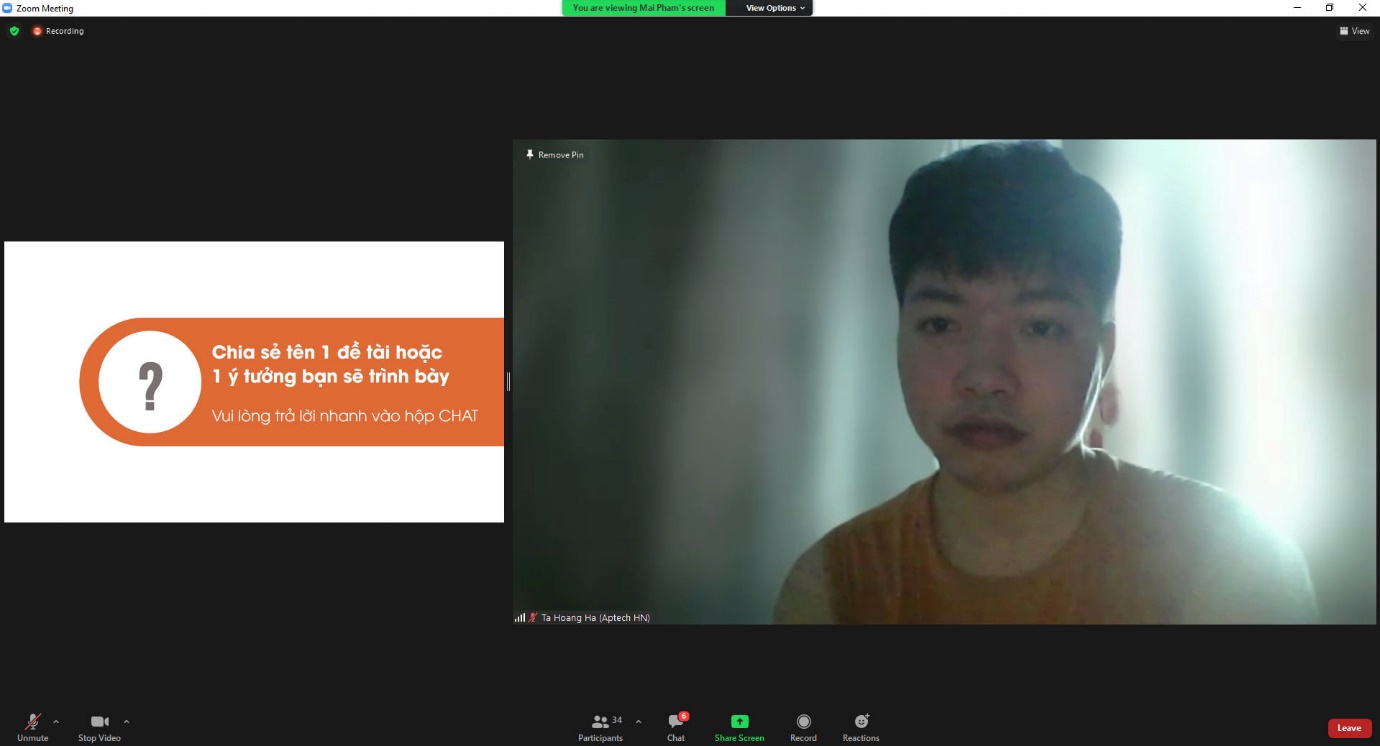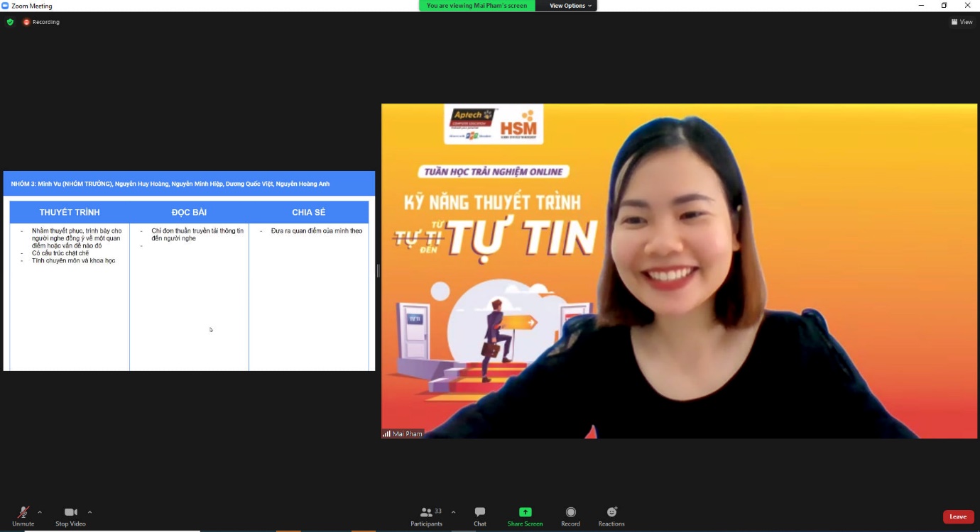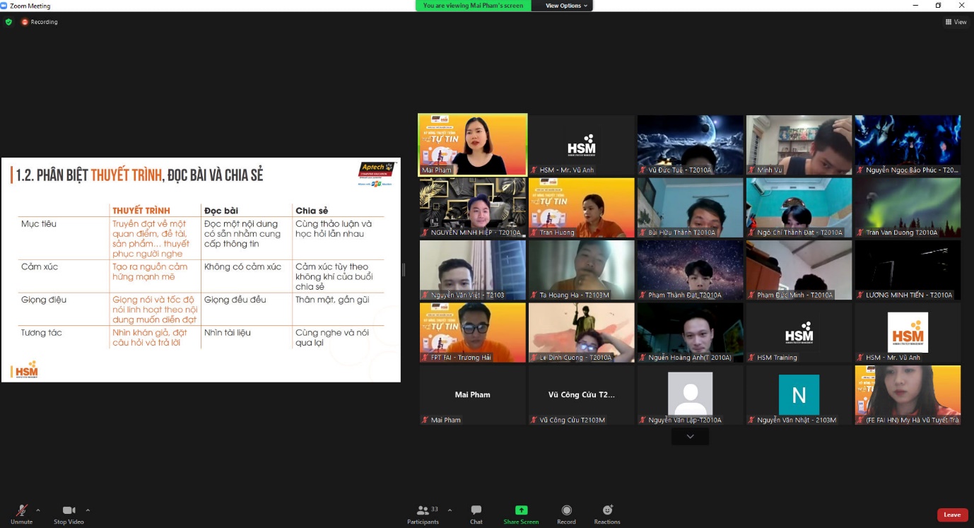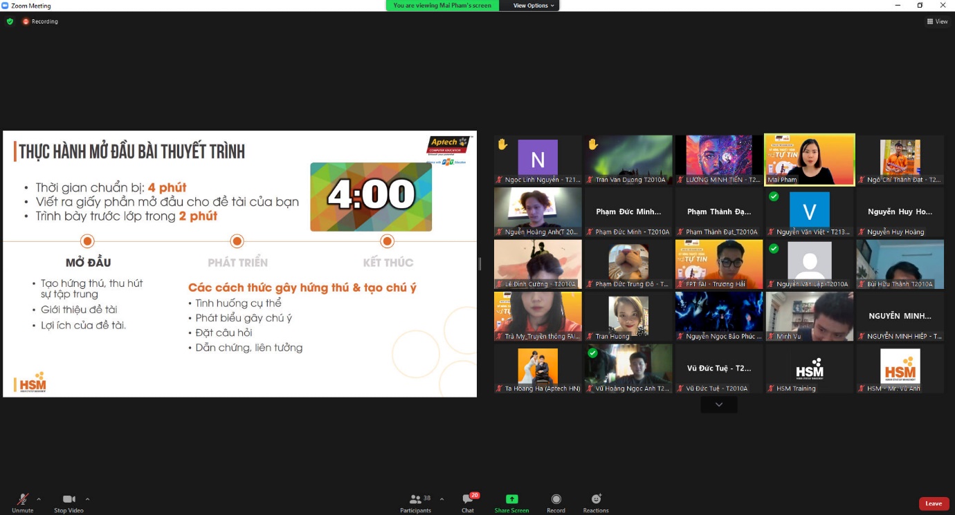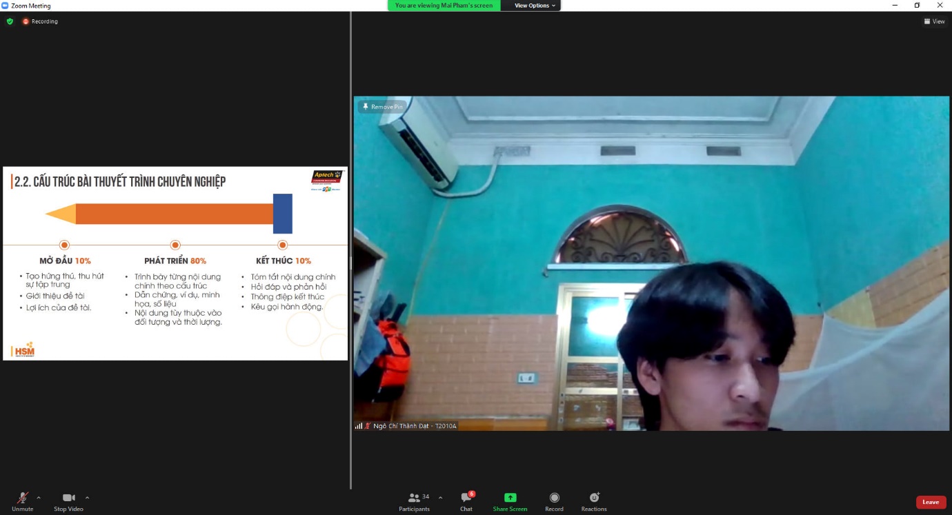 Trong mùa dịch Covid-19, các hoạt động học tập của sinh viên FPT Aptech vẫn luôn được diễn ra rất thành công dưới hình thức online, đảm bảo chất lượng học tập cho các bạn sinh viên. Những lớp học trải nghiệm “Kỹ năng thuyết trình” cũng đã được tổ chức hiệu quả thông qua nền tảng trực tuyến Zoom Meeting đã giúp sinh viên dễ dàng học tập dù không thể trực tiếp đến trường.